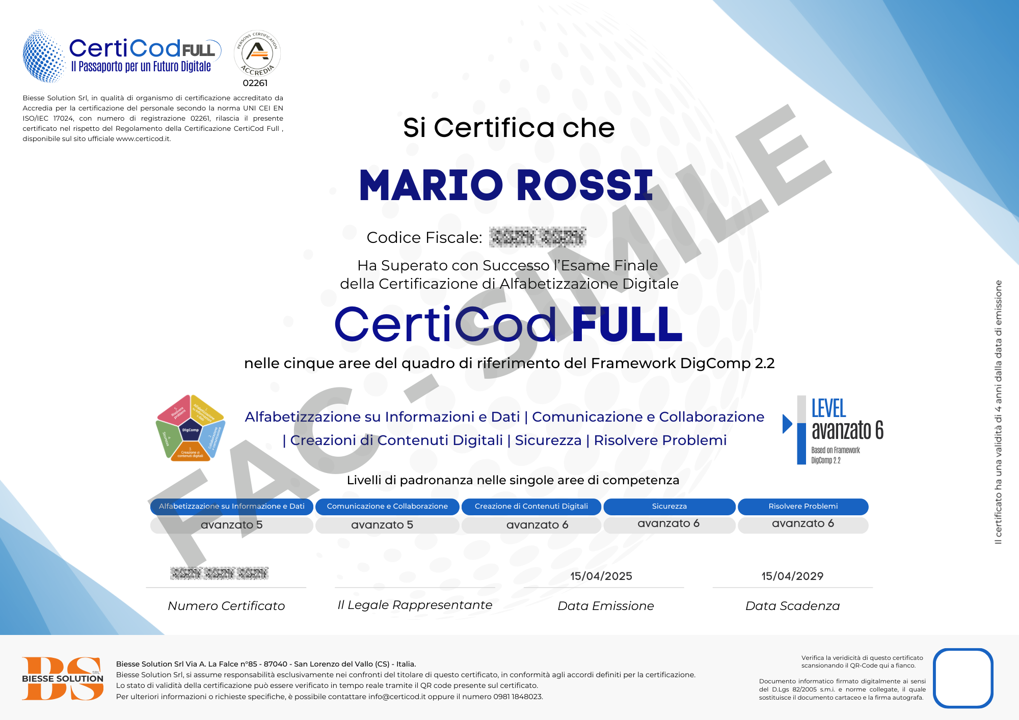La Certificazione Internazionale di Alfabetizzazione Digitale CertiCod FULL, conforme al framework DigComp 2.2, è un titolo rilasciato dal nostro Organismo di Certificazione Accreditato Accredia.
